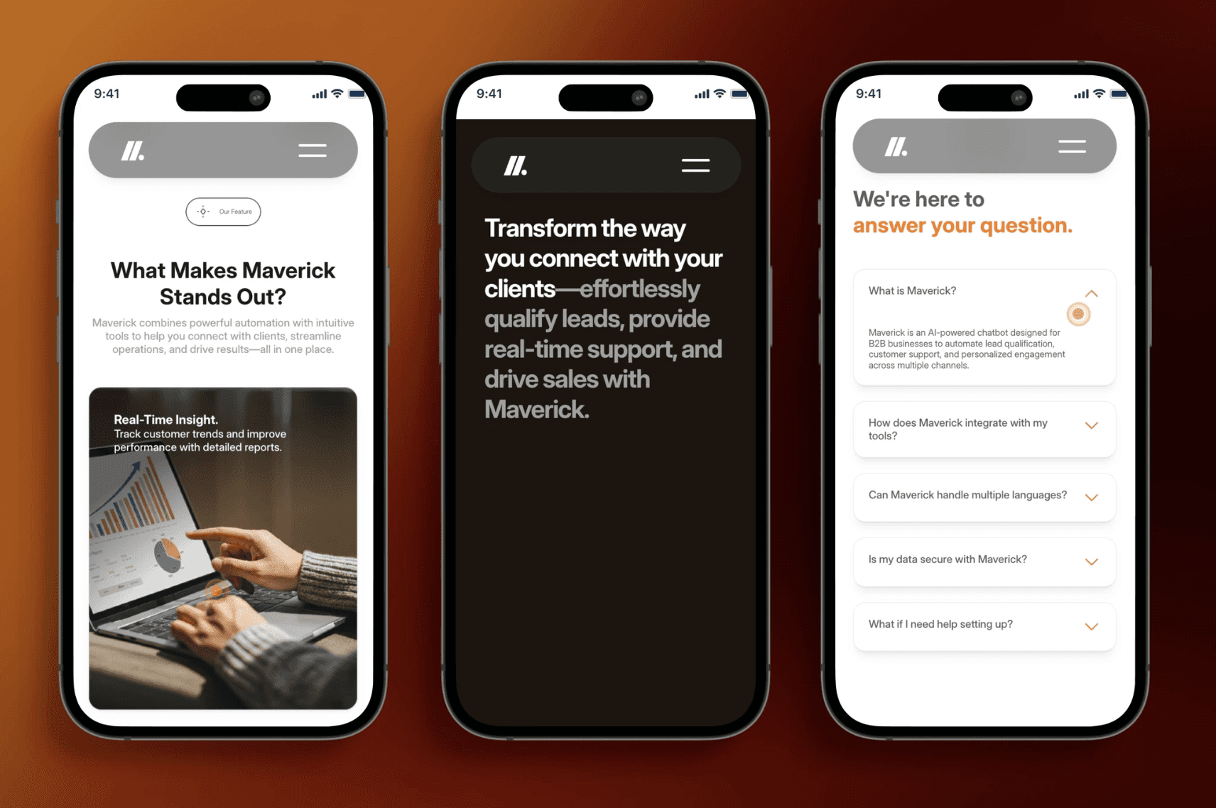 Maverick is an AI chatbot brand offering conversational automation for businesses—from customer service to sales enablement. As the AI market becomes increasingly crowded, Maverick needed a distinct online identity that communicates innovation, confidence, and clarity while showcasing its platform's capabilities to both technical and non-technical buyers.